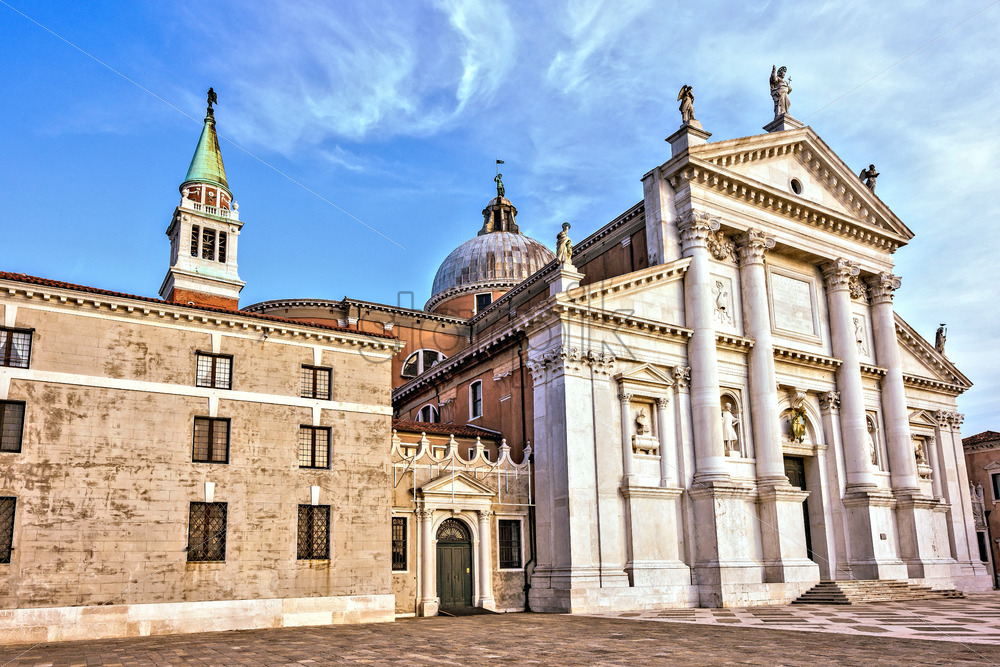 Daylight side view to San Giorgio Maggiore church facade with entrance. Bright blue sky with clouds on background. Negative copy space, place for text. Venice, Italy