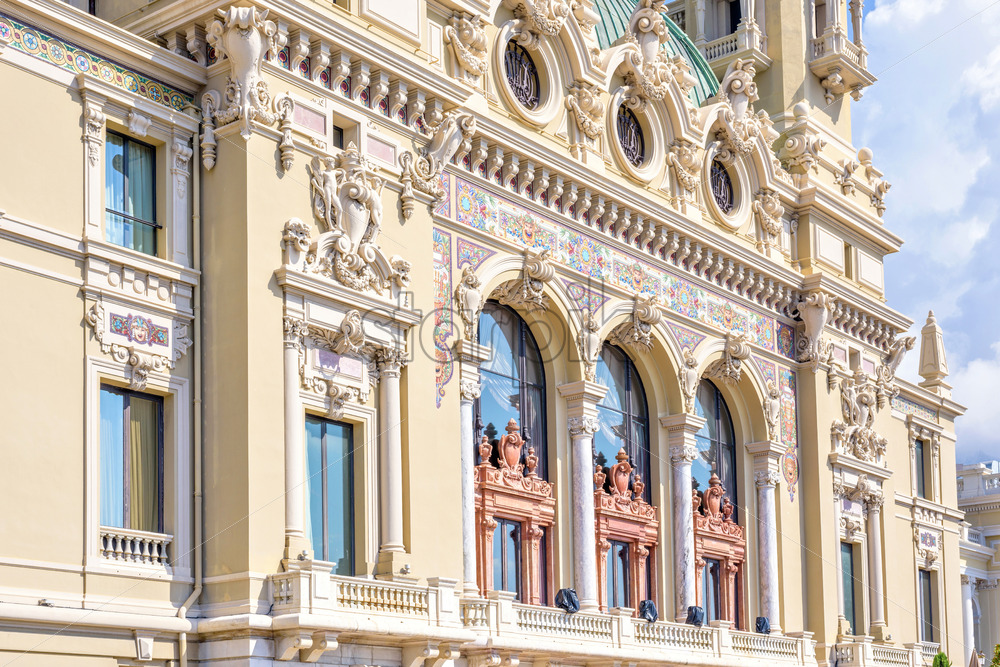 Daylight sunny view to a museum facade with classic ornaments drawings in Monaco, France. View from side. Bright blue sky with clouds on background