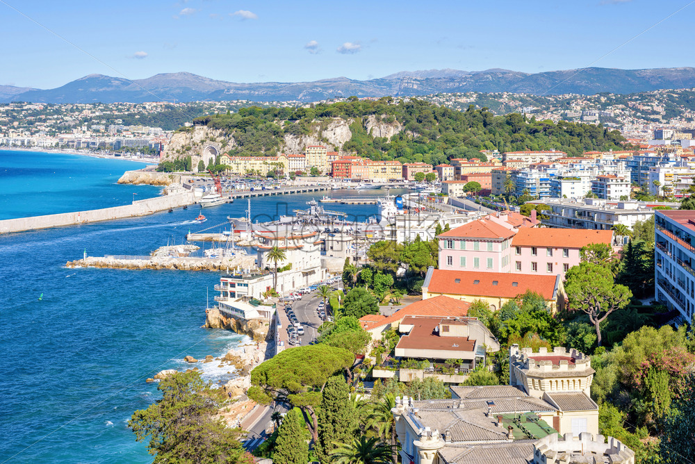Daylight sunny view to city buildings. Bright blue sea and sky. Mountains on background. Antibes, France