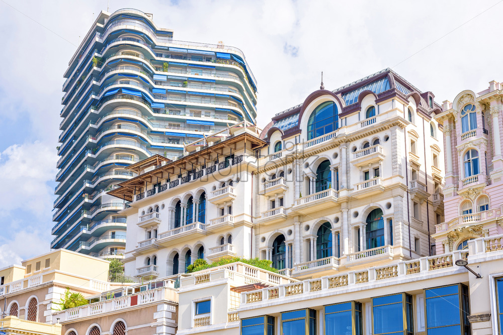 Daylight sunny view to hotel buildings with classic ornamented facade in Monaco, France. Mountains full of trees on background. Bright blue sky with a few clouds
