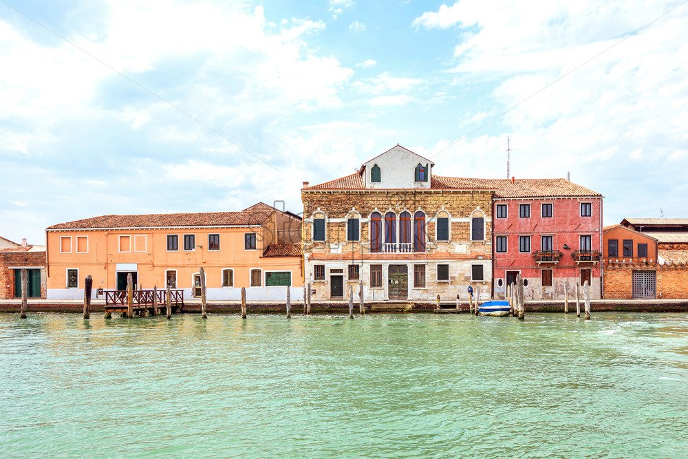 Daylight view from boat to historic architecture buildings in sunny day. Bright blue sky with clouds on background. Light reflecting on water. Negative copy space, place for text. Venice, Italy