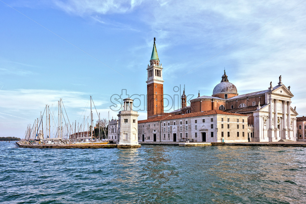 Daylight view from boat to San Giorgio Maggiore church with ornamented facade. Little port with parked boats and bright blue sky with clouds on background. Place for text. Venice, Italy
