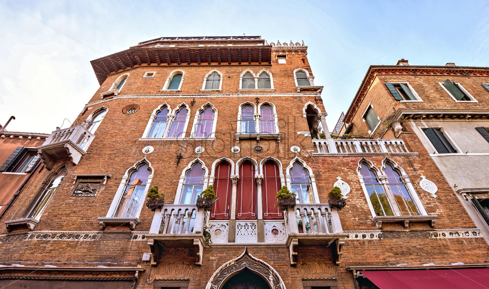Daylight view from bottom to old brick ornamented facade of a building with balconies. Bright blue cloudy sky on background. Venice, italy