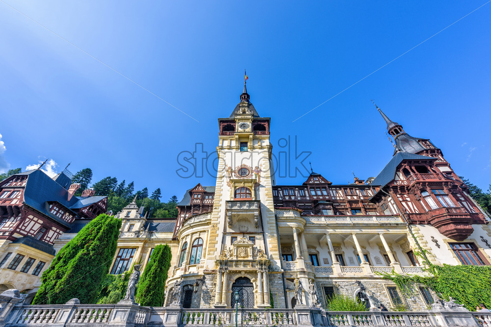 Daylight view from bottom to ornamented facade of Peles castle with tower and bright blue sky with sun flare. Romanian kings summer residence in Carpathian Mountains. Sinaia, Romania Royalty Free Stock photo