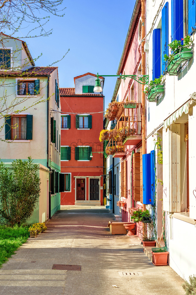Daylight view to a street of city with vibrant colorful buildings. Shadows and sun shining. Place for text. Burano, Italy