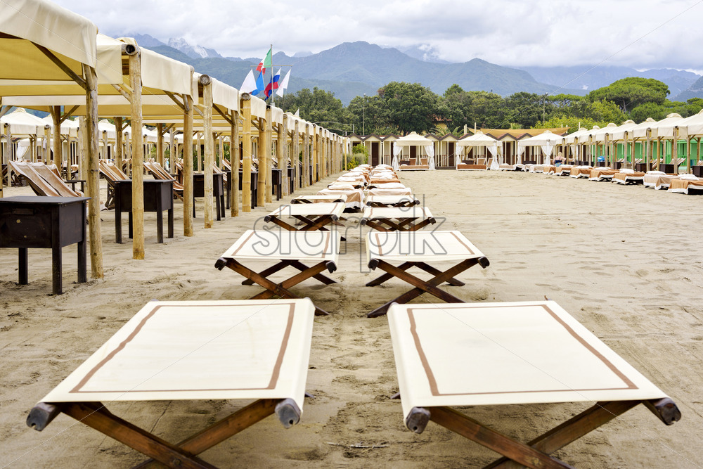 Daylight view to beige sunchairs and sunshades on beach. Changing rooms, big mountains and cloudy sky on background. Negative copy space, Place for text, Forte dei marmi, Italy