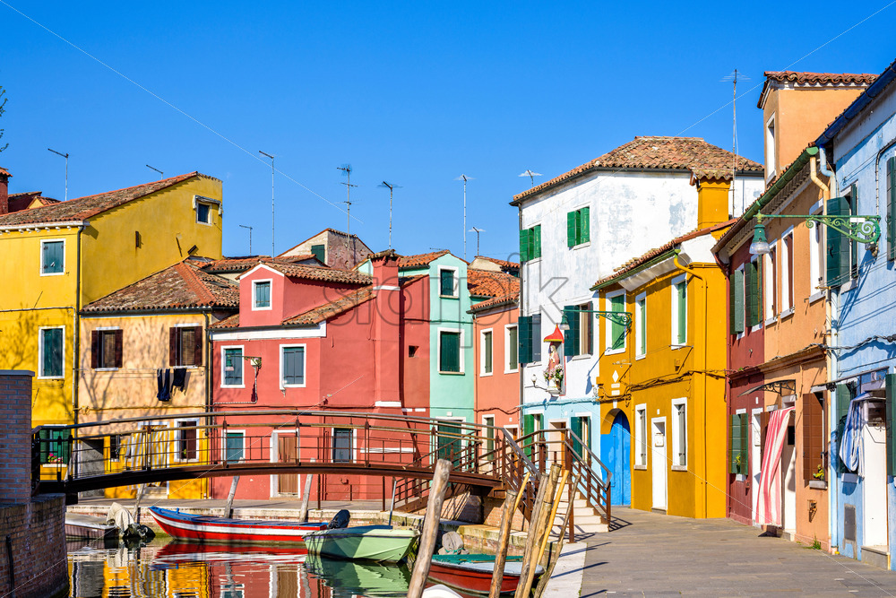 Daylight view to colorful bright buildings and woman taking picture of a man on bridge. Bright blue clear sky, Burano, Italy Royalty Free Stock photo