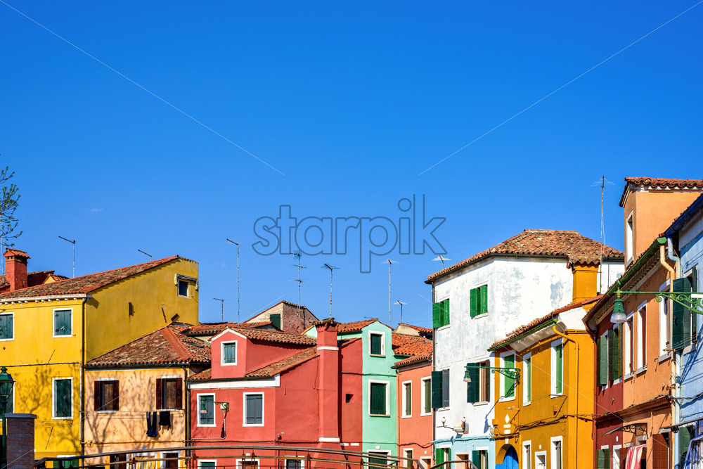 Daylight view to colorful buildings facades with chimney and antennas on rooftop. Bright blue clear sky. Negative copy space, place for text. Burano, Italy Royalty Free Stock photo