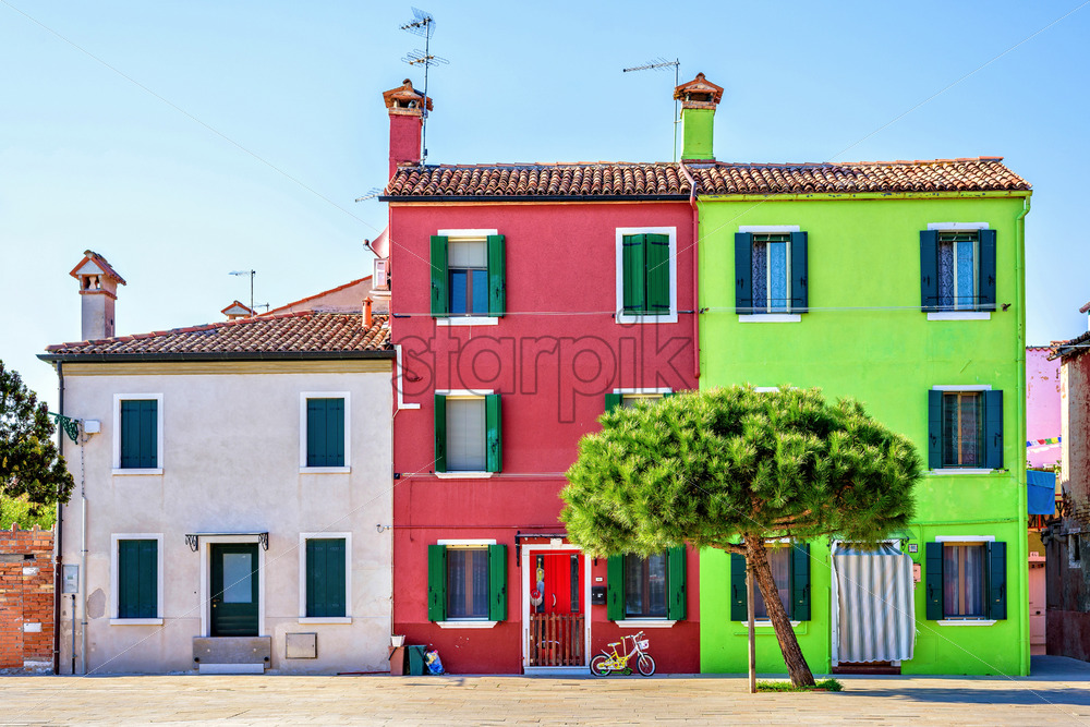 Daylight view to complementary red and green colored buildings with chimney. Cozy and calm atmosphere. Green tree in front. Bright blue clear sky. Negative copy space, place for text. Burano, Italy