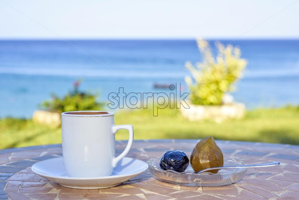 Home » Shop » nature » Daylight view to cup of coffee on table with local sweets and spoon. Sea view and sky on background. Protaras, Cyprus island.