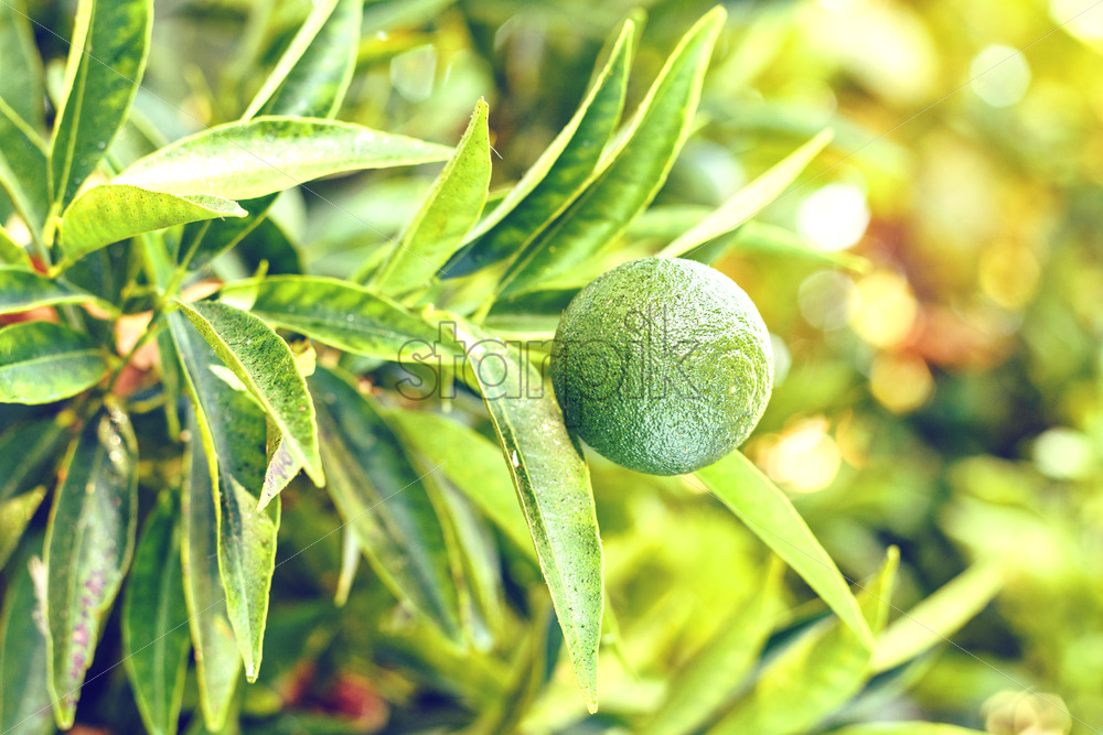 Daylight view to green lime growing on tree. Green leaves and bokeh on background. Negative copy space, place for text. Kakopetria, Cyprus