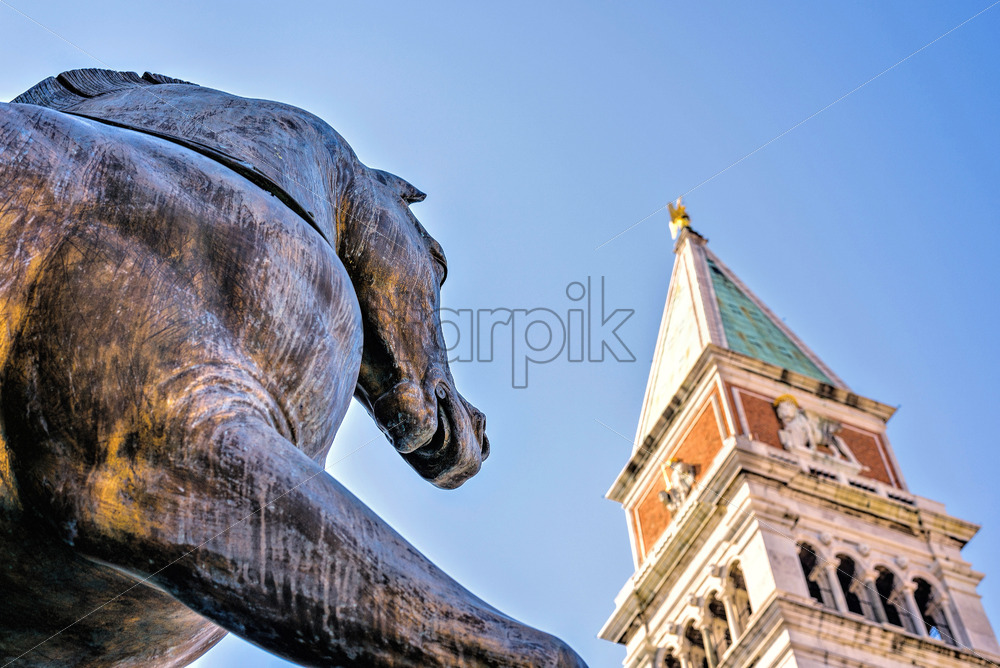 Home » Shop » city » Daylight view to Horses of Saint Mark with campanile on background. Bright blue clear sky. Negative copy space, place for text. Venice, Italy