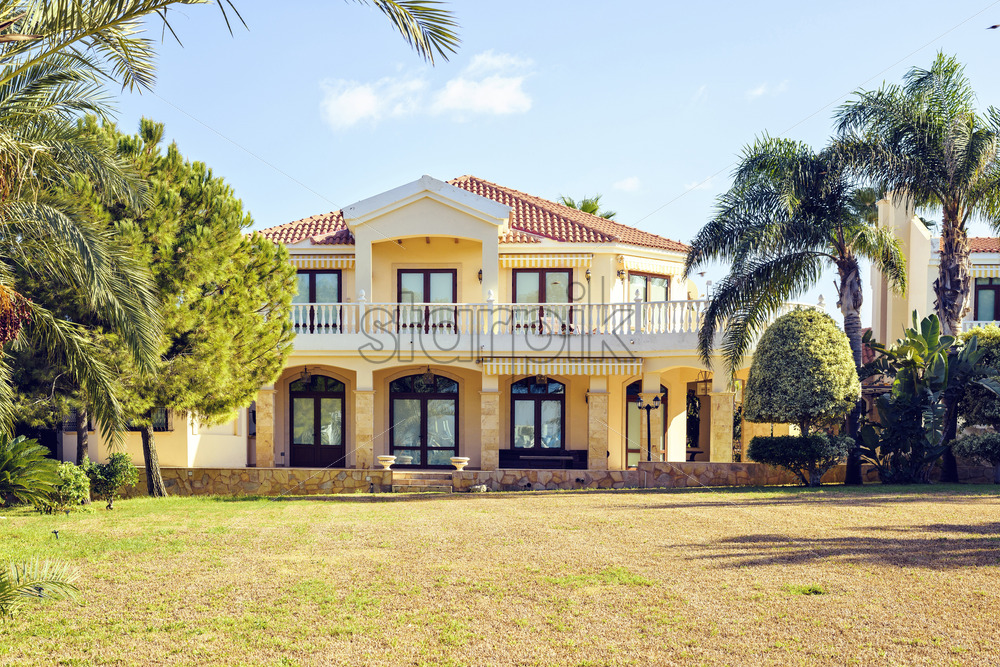 Daylight view to modern house with two levels. Green trees on side and empty garden. Bright blue clear sky. Negative copy space, place for text. Protaras, Cyprus