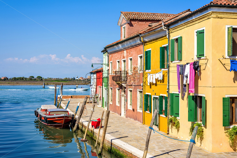 Home » Shop » city » Daylight view to parked boats in a canal with image reflecting on water. Colorful buildings and bright blue clear sky. Negative copy space, place for text. Burano, Italy