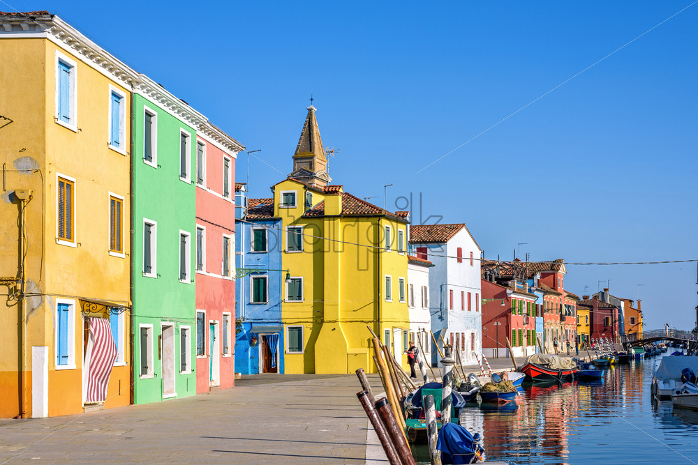 Daylight view to parked boats in a canal with image reflecting on water. Colorful buildings and bright blue clear sky. Negative copy space, place for text. Burano, Italy Royalty Free Stock photo