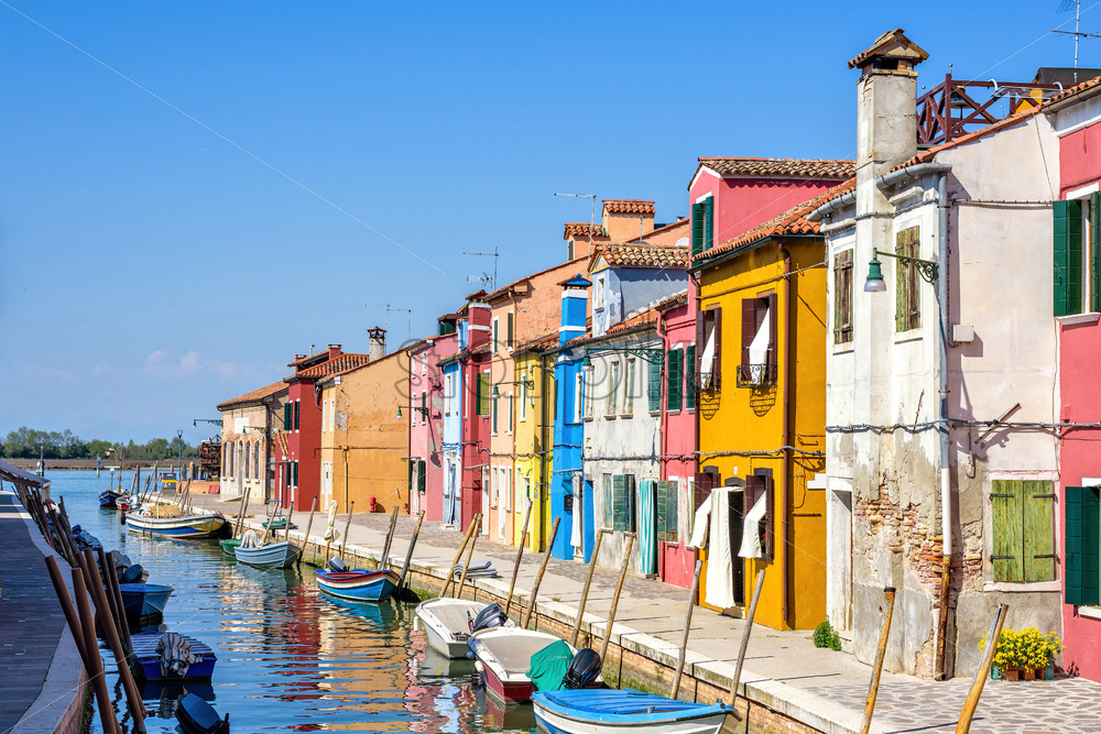 Home » Shop » city » Daylight view to parked boats in a canal with image reflecting on water. Colorful buildings and bright blue clear sky. Negative copy space, place for text. Burano, Italy