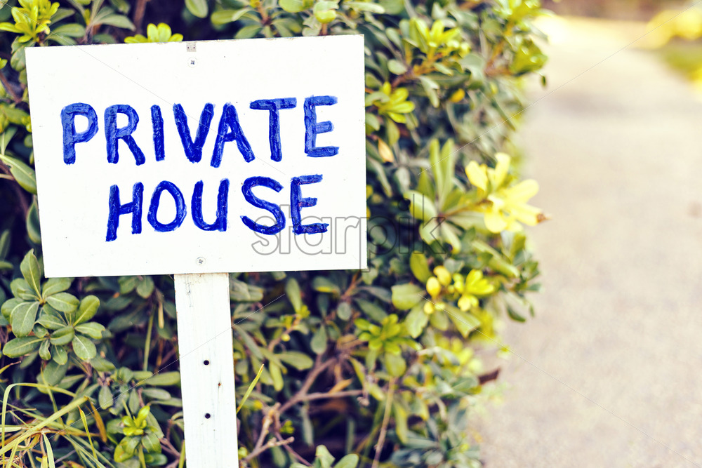 Daylight view to private house wood sign. Green bushes and road on background. Protaras, Cyprus