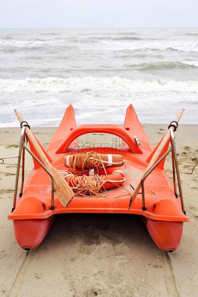 Daylight view to red boat parked on sand with two lifesavers on board. Rising waves and bright blue sky on background. Negative copy space, place for text. Forte dei Marmi, Italy