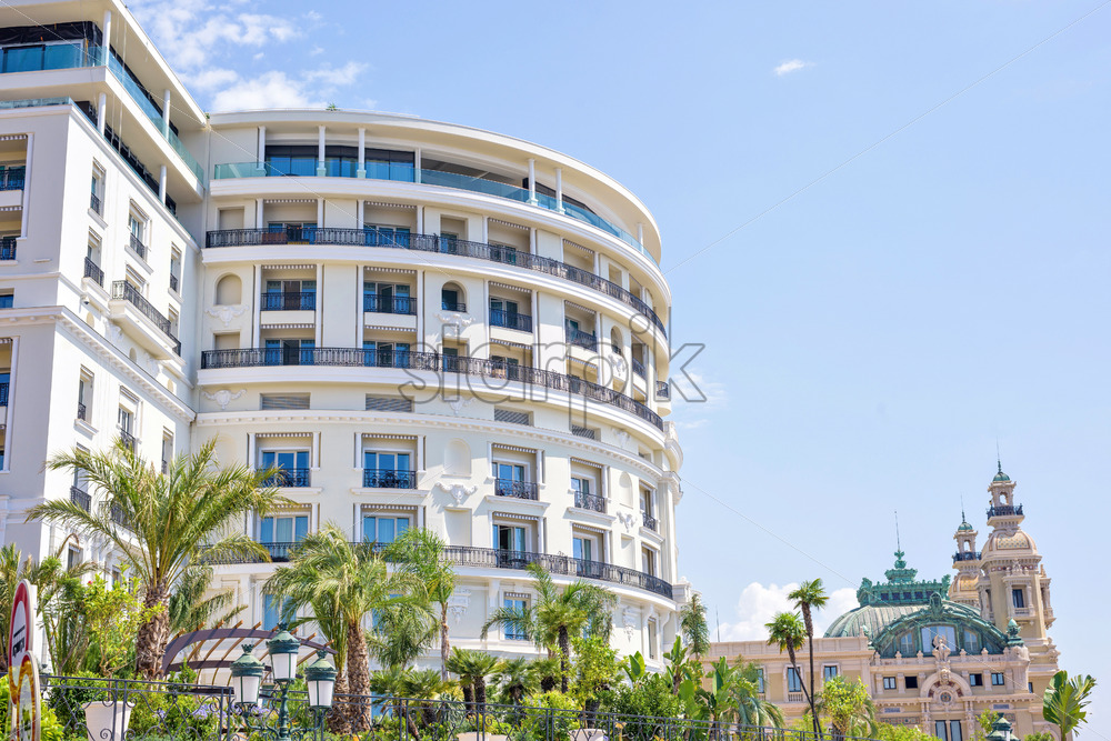 Daylight view to round shape hotel building facade with ornaments. Bright blue sky with a few clouds on background. Monaco, France