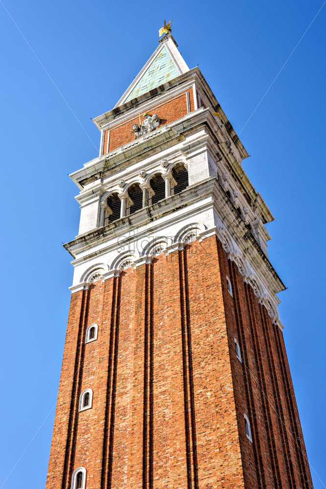 Daylight view to Saint Mark’s Campanile bell tower isolated from San Marco square. Bright blue clear sky. Negative copy space, place for text. Venice, Italy