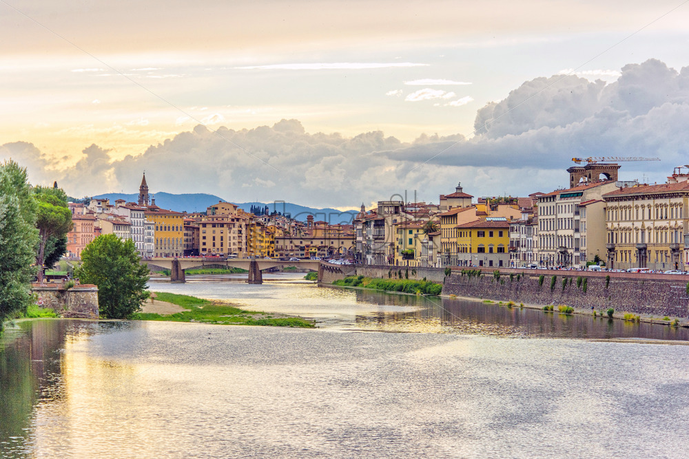 Daylight view to sunset above Arno river with reflections. Green trees, city buildings, bridge and Cathedral Saint Mary of the Flower on background. Florence, Italy