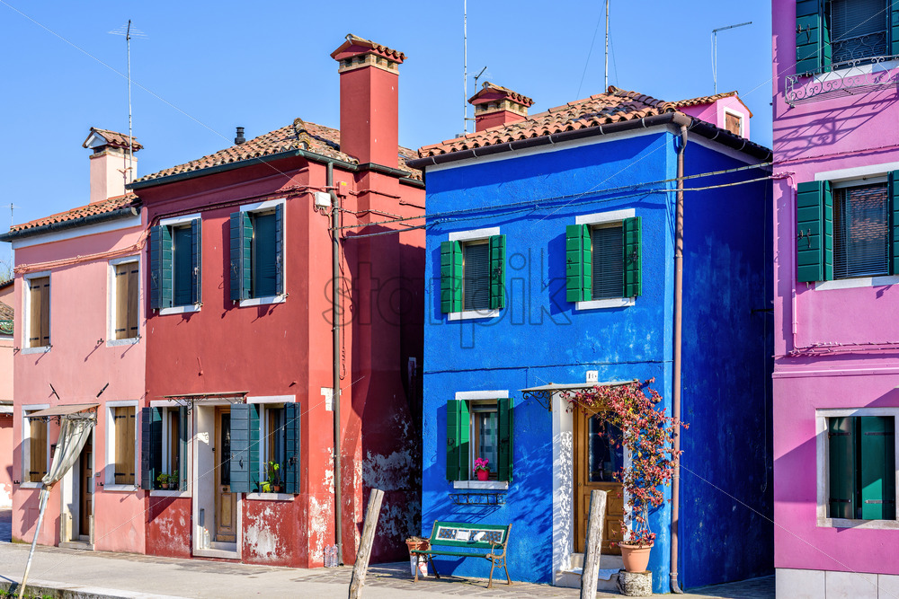Daylight view to vibrant colorful houses facades and a part of sidewalk with bench. Bright blue clear sky. Burano, Italy Royalty Free Stock photo