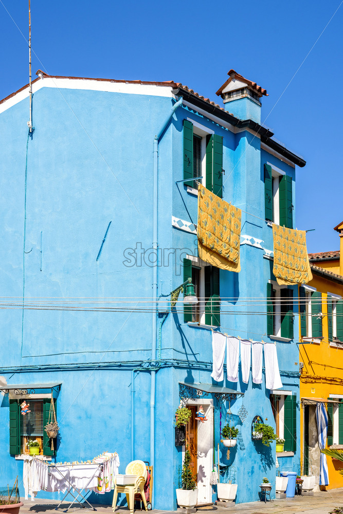 Daylight view to vibrant housefront facades with clothes drying outside. Negative copy space, place for text. Bright blue clear sky. Burano, Italy