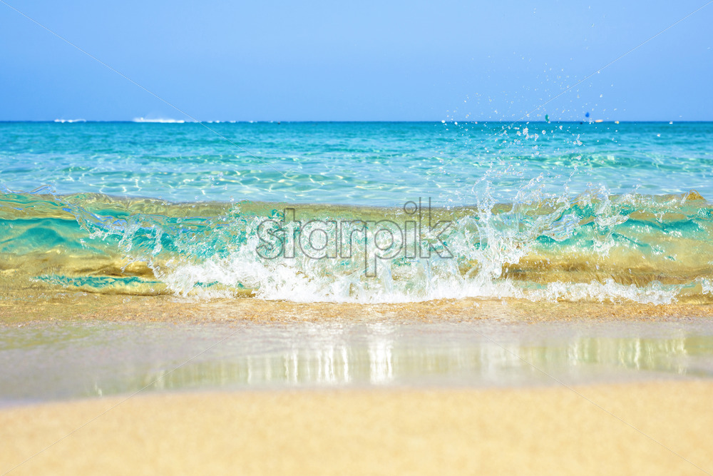 Daylight view to wave throwing above sand. People relaxing in water on background. Negative copy space, place for text. Protaras, Cyprus.