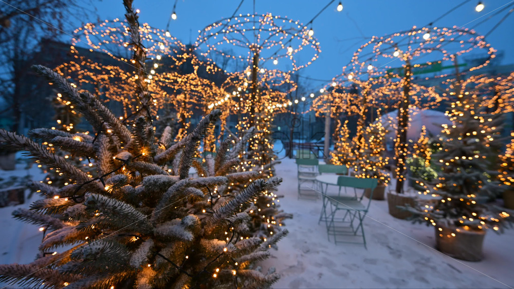 Decorated Christmas trees covered in snow and illuminated with warm fairy lights in a winter garden or market setting