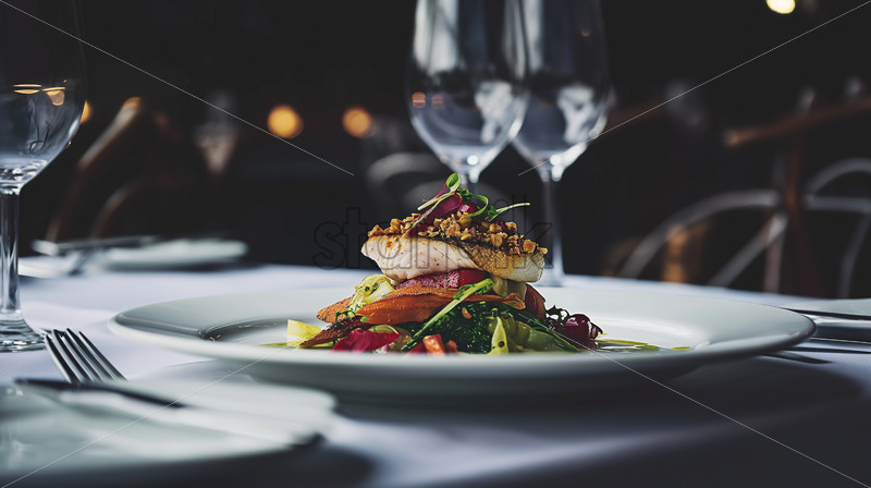 Barramundi adorned with a Macadamia Crust . The scene is elegantly propped with Australian wine glasses, native herbs, and modern dinnerware.