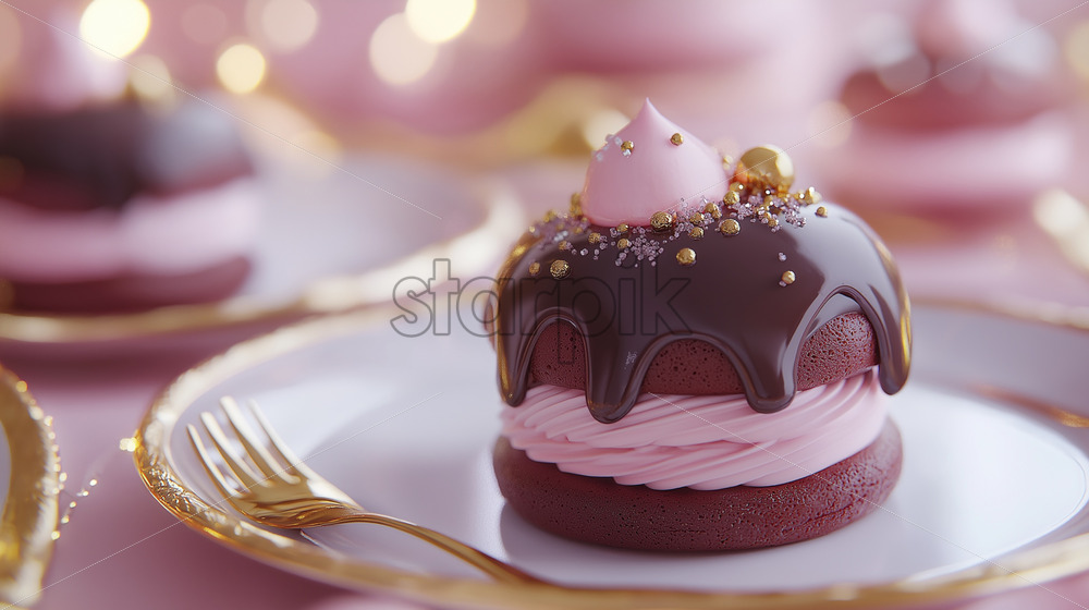 delicious elegant cake with pink cream and melted chocolate