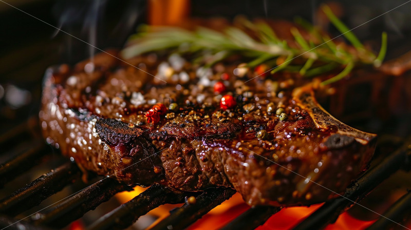 Delicious Steak on a grill with herbs cooking