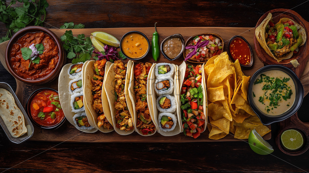 delicious tacos with sushi and global street food: bao buns, kebabs, sliders, and loaded with chips