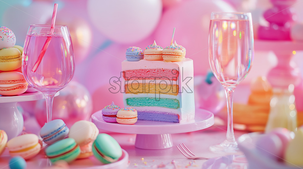 dessert table featuring rainbow-layered cakes