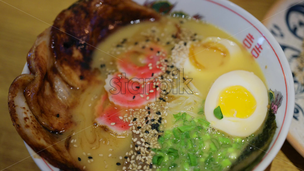 Detailed close up of ramen soup with pork slices, egg half, noodles, and chopped green onions