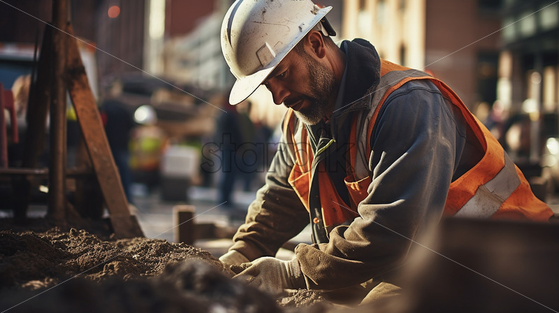 A hardworking construction worker, fully geared in PPE, focuses intently on a task, hands gloved, as he works on the dirt ground against a blurred background.
