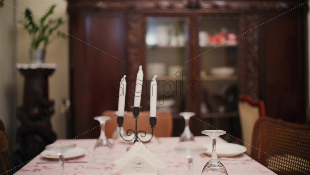 Dining table set with plates, glasses, and white candles in a cozy home interior