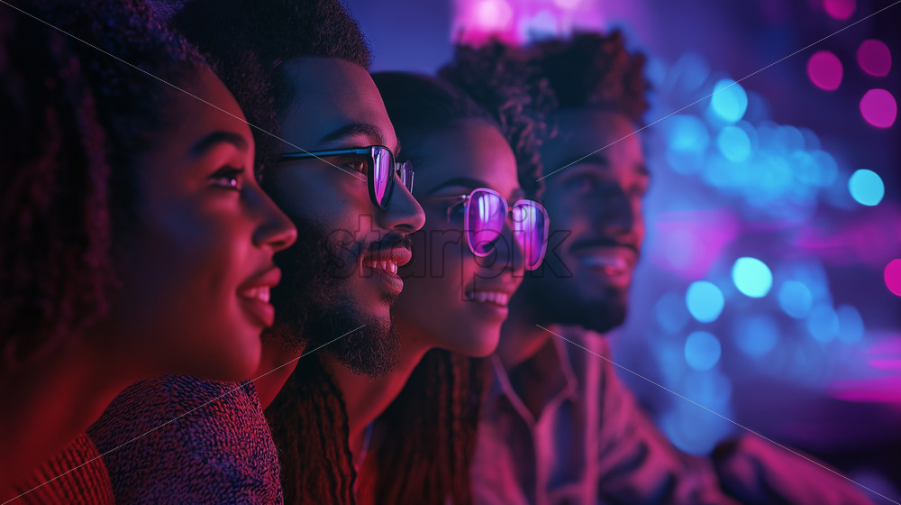 Home » Shop » AI Illustration » diverse friends meeting in a quantum-metaverse lounge