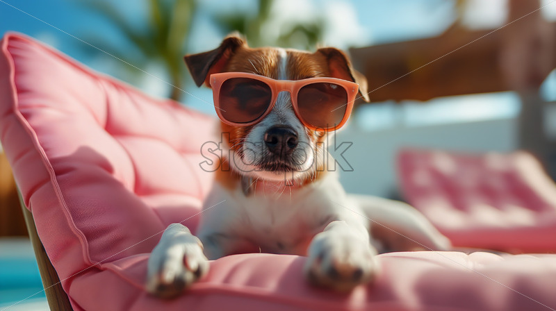 Home » Shop » AI Illustration » Dog resting on a peach sun bed summer background