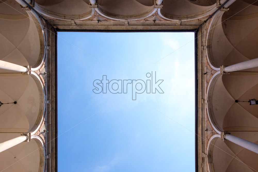 Doria Tursi Palace backyard. Abstract view from bottom to blue sky. Genoa, Italy Royalty Free Stock photo