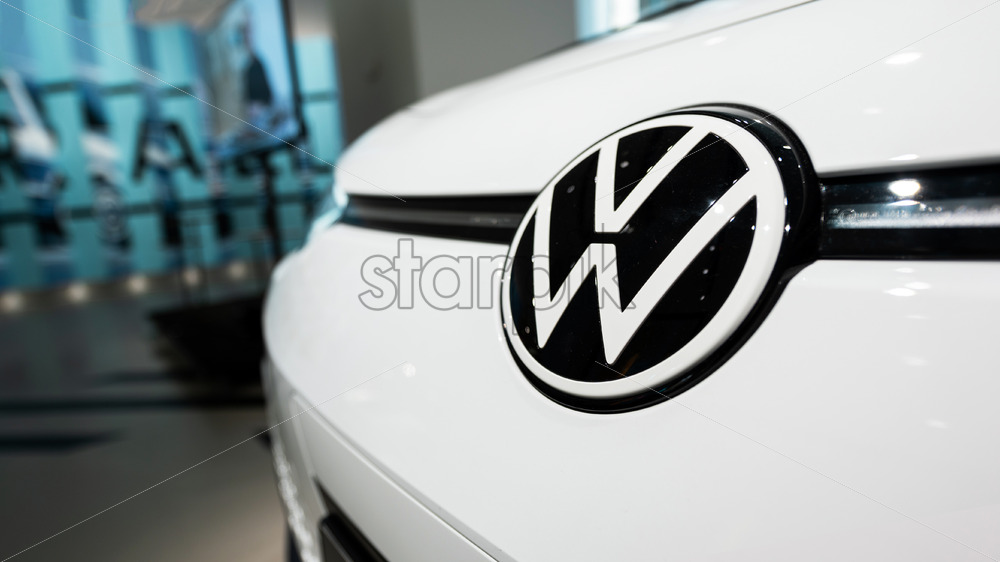 BERLIN, GERMANY – SEPTEMBER, 2022: View of DRIVE Volkswagen Group Forum with showed electric ID.3, close-up logo view