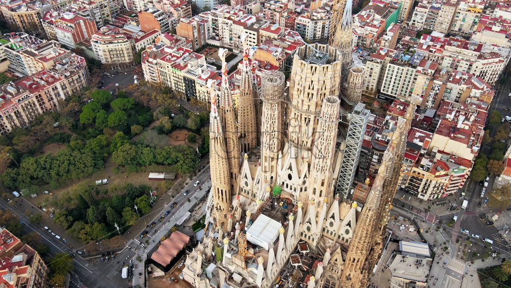 Drone cinematic view of Sagrada Familia. Aerial drone view of Barcelona, Spain. Blocks with multiple residential buildings and Sagrada Familia. Download stock video footage Royalty Free Stock Video Footage