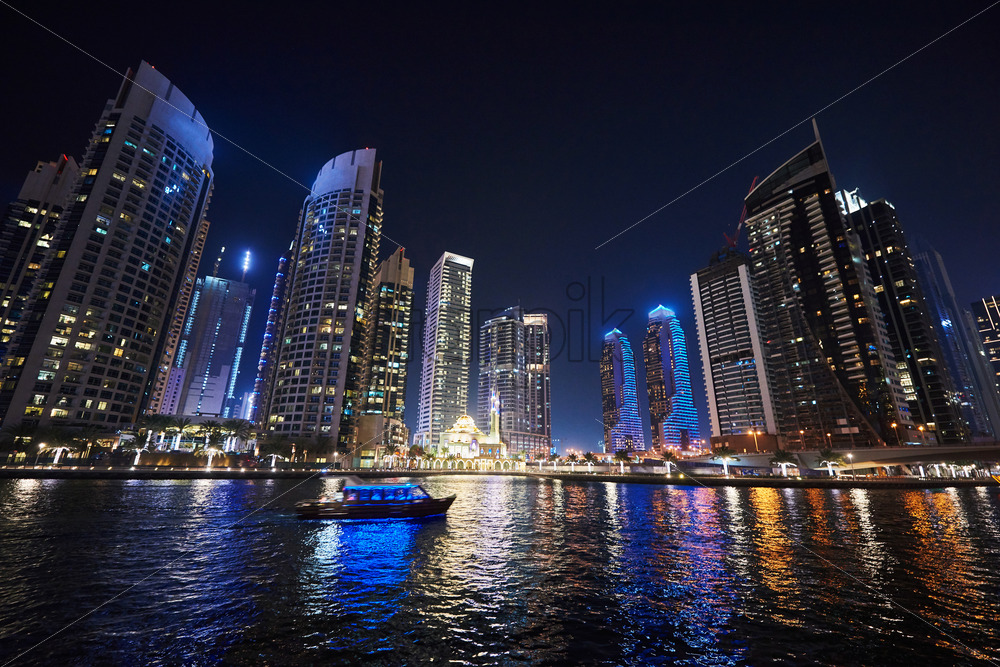 Dubai Marina at night with colorful touristic boats cruising on water. United Arab Emirates Royalty Free Stock photo
