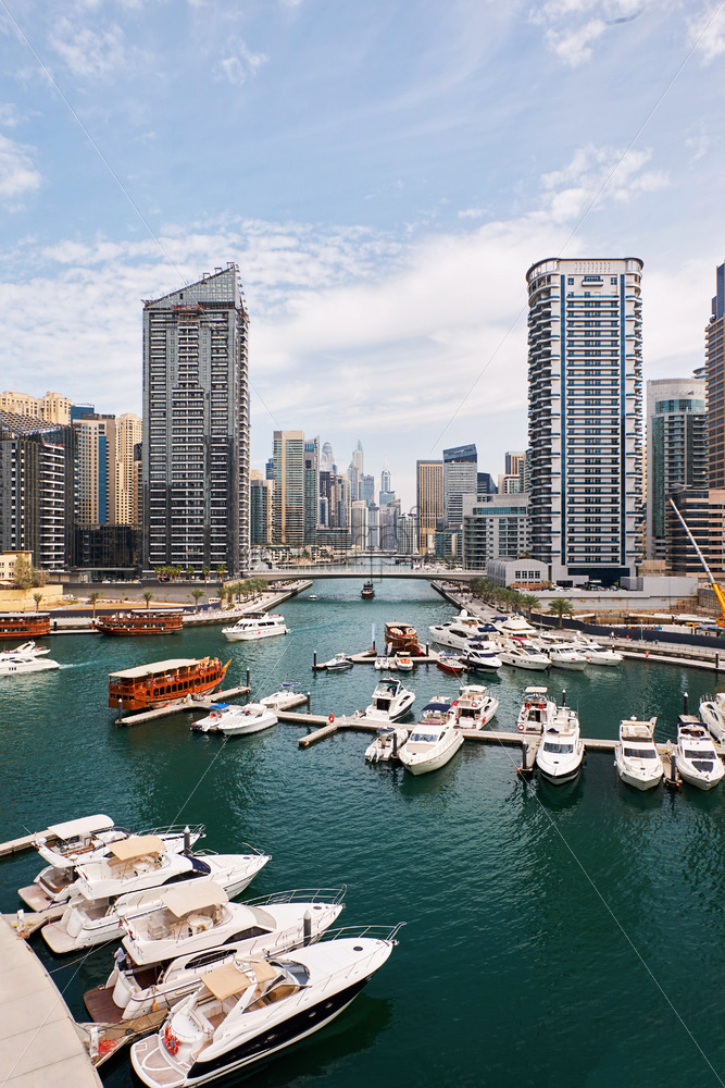 Dubai marina cityscape at daylight. Clear sky. United Arab Emirates. Yachts parked in port.