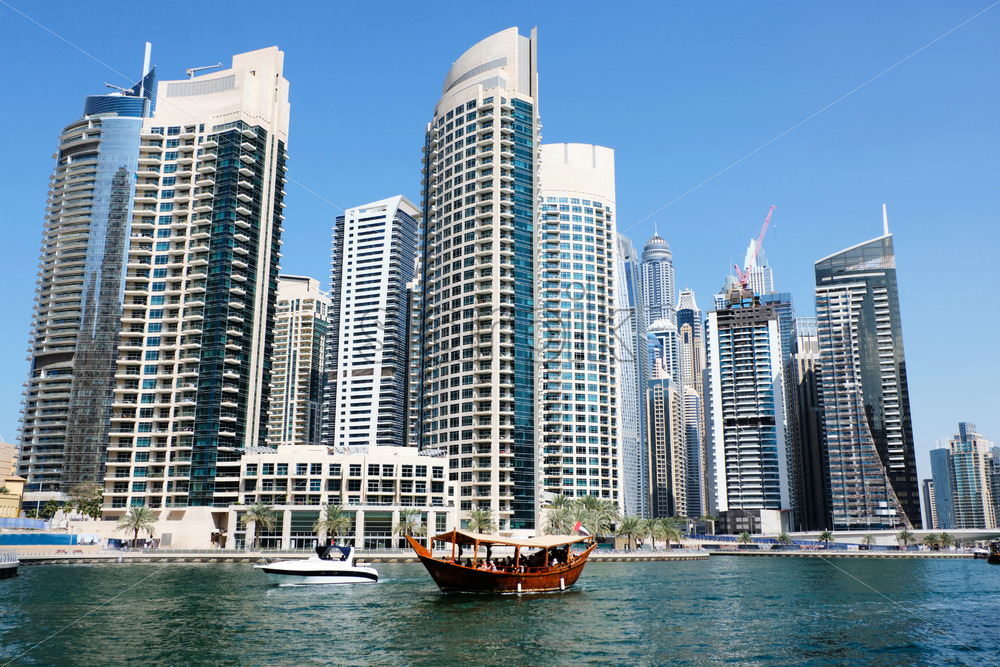 Dubai marina cityscape at daylight. Clear sky. United Arab Emirates