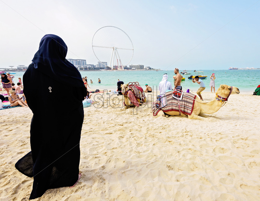 Home » Shop » photo » DUBAI, UAE – 23 FEBRUARY, 2019: a Muslim woman dressed in paranja on the beach