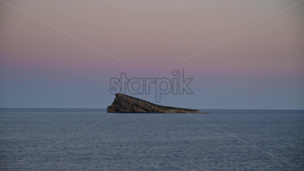 Dusk falling over a lonely offshore islet as a gull glides through a pastel sky in Alicante, Spain Royalty Free Stock Video Footage