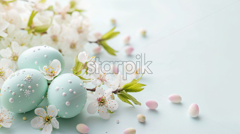 Easter postcard with pastel eggs on a vintage tray with teacups and daisies on white background