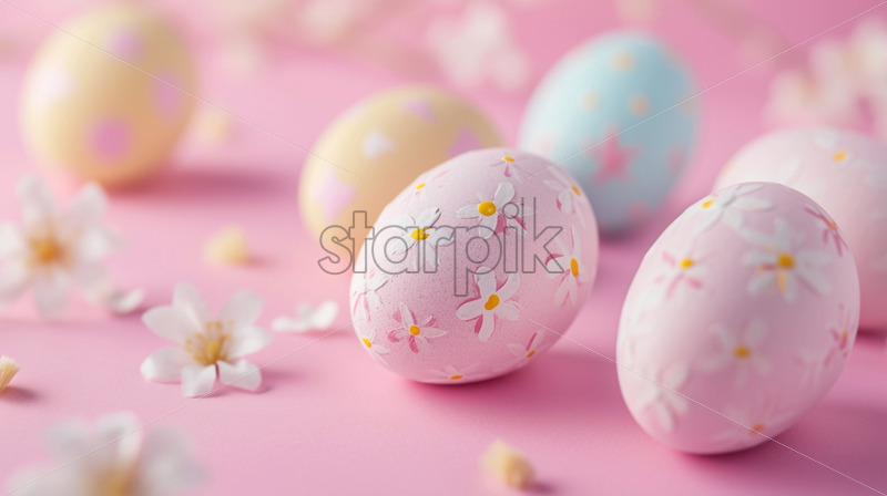 Easter postcard with pastel-colored easter eggs surrounded by cherry blossoms