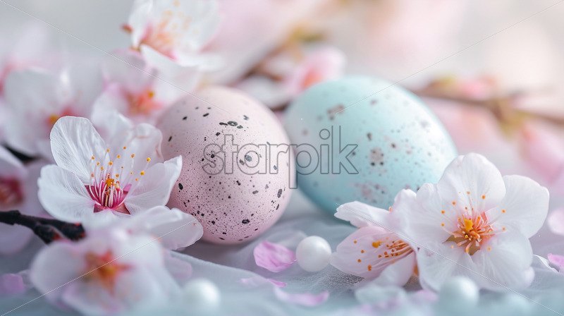 Easter postcard with pastel-colored easter eggs surrounded by cherry blossoms